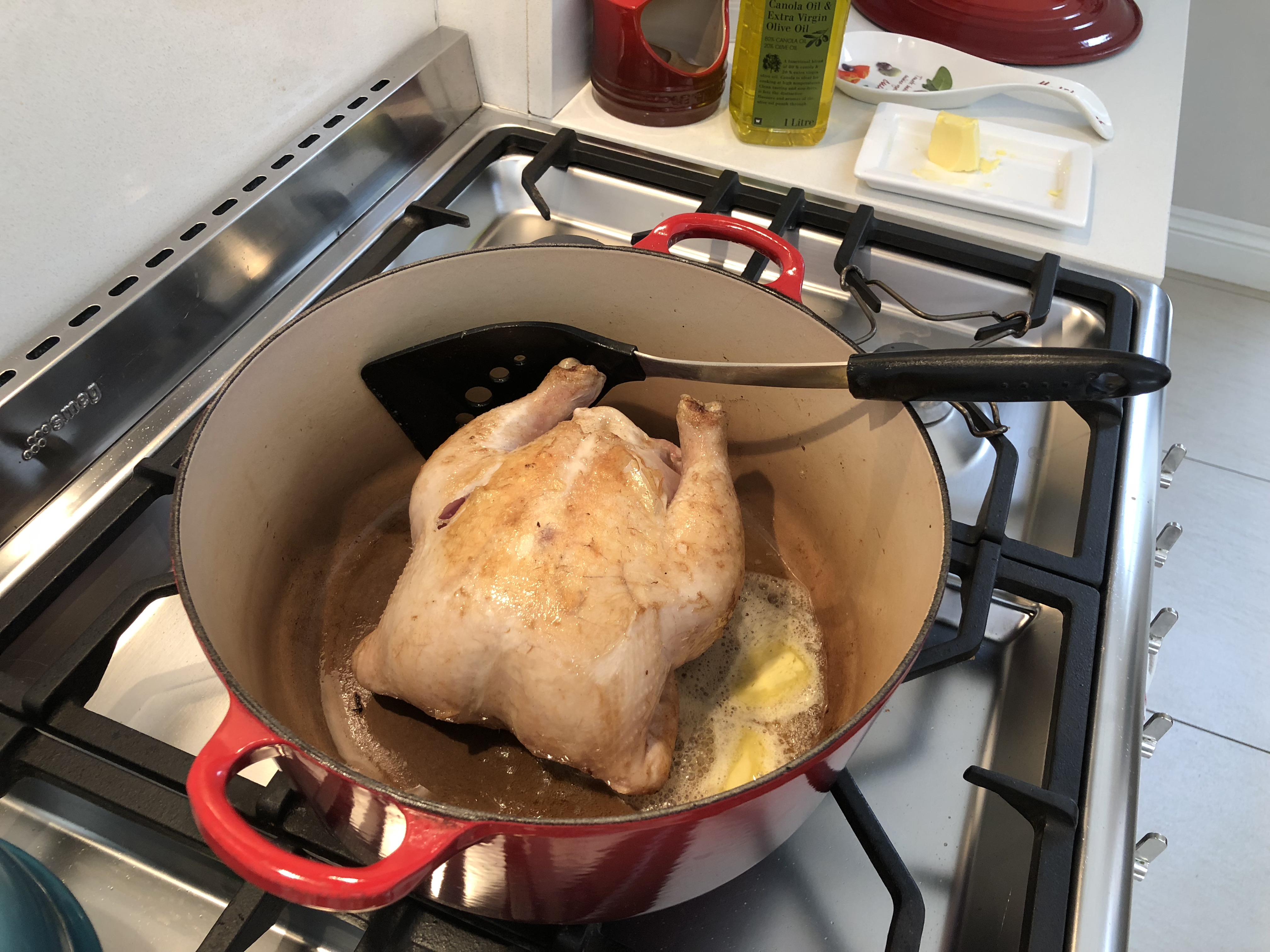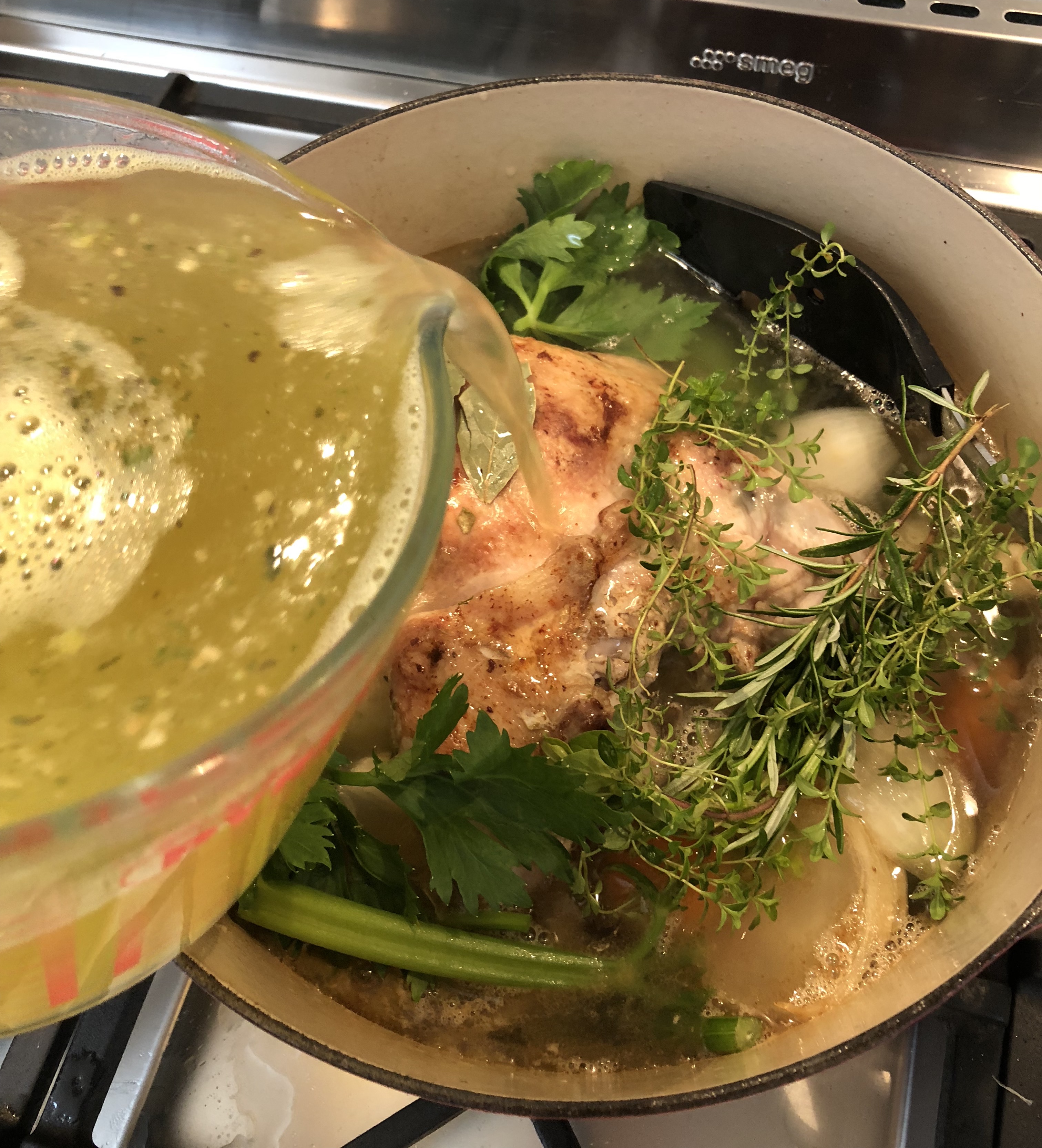In a large 5 litre pot, brown the chicken in a little olive and butter. This helps seal the moisture in the chicken and the crisping up of the chicken skin gives it a great flavour. Nothing worse than a flabby boiled chicken!