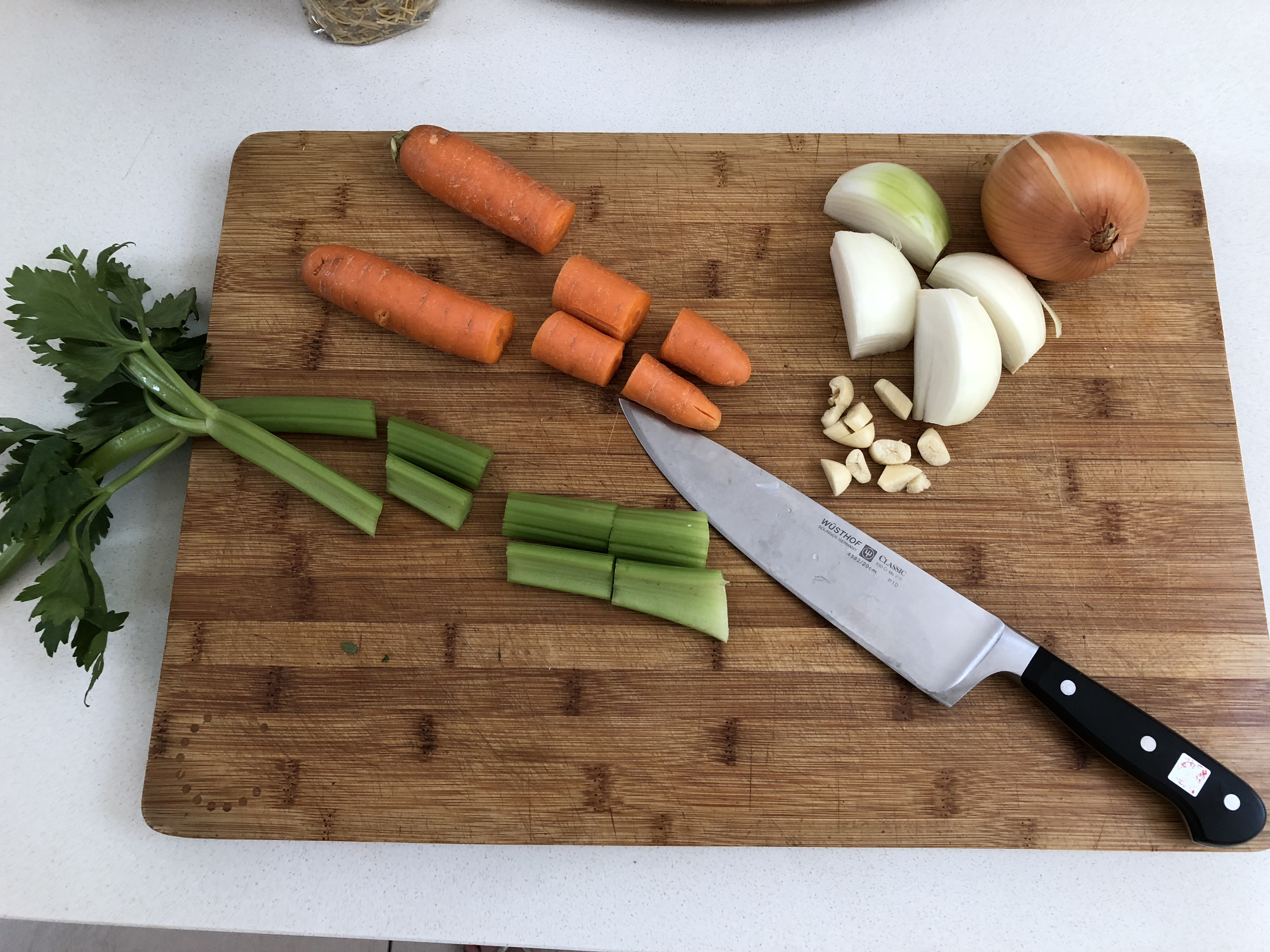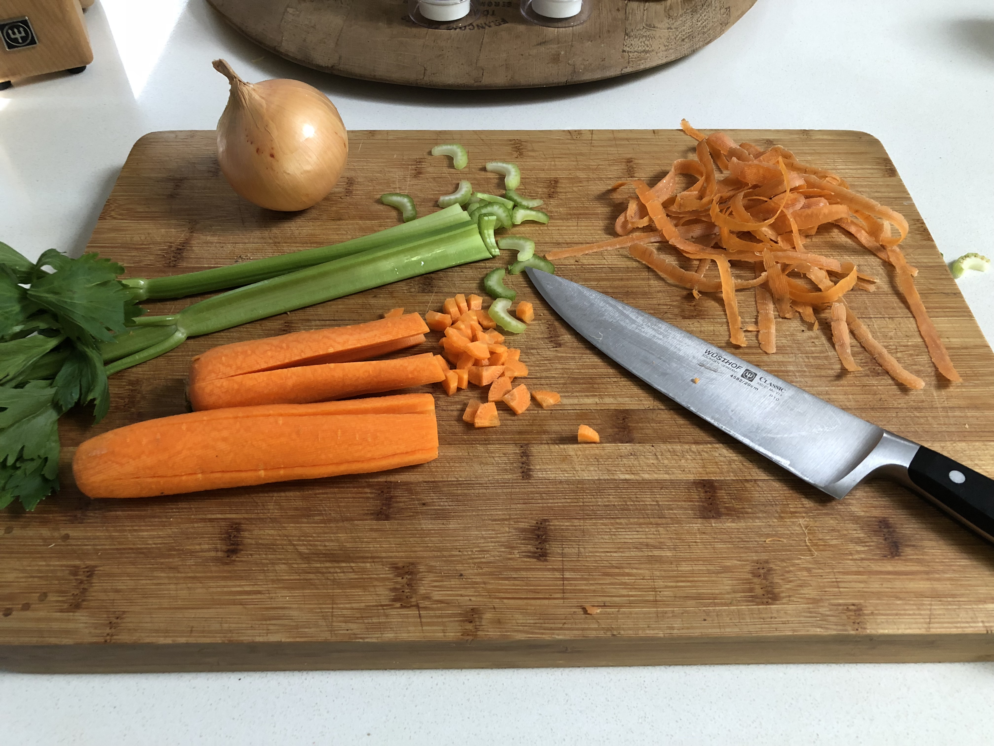 For the soup vegetables, chop everything fairly finely. Peel and chop the remaining onion, carrots and celery. (Don’t use the celery leaves this time).