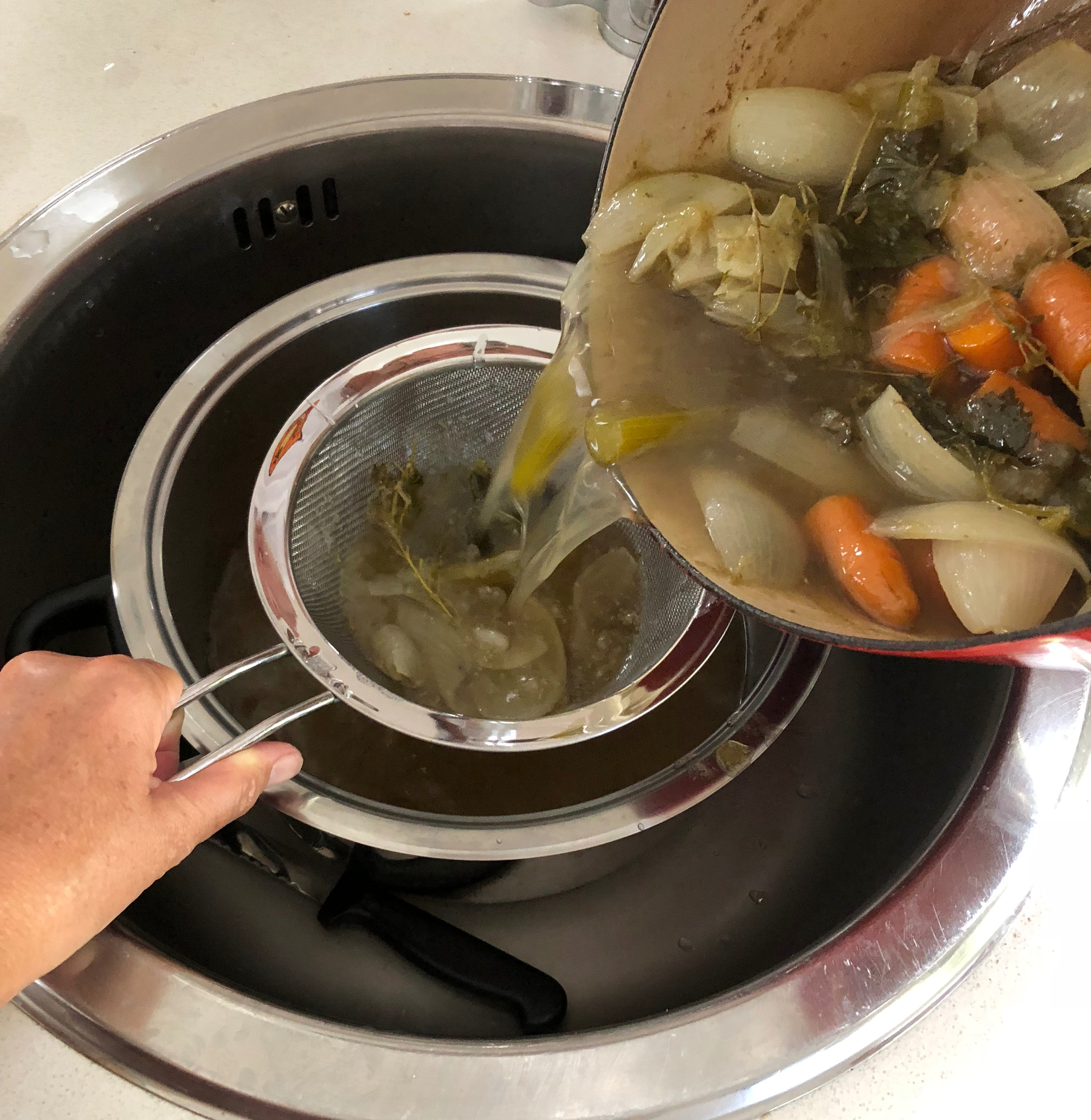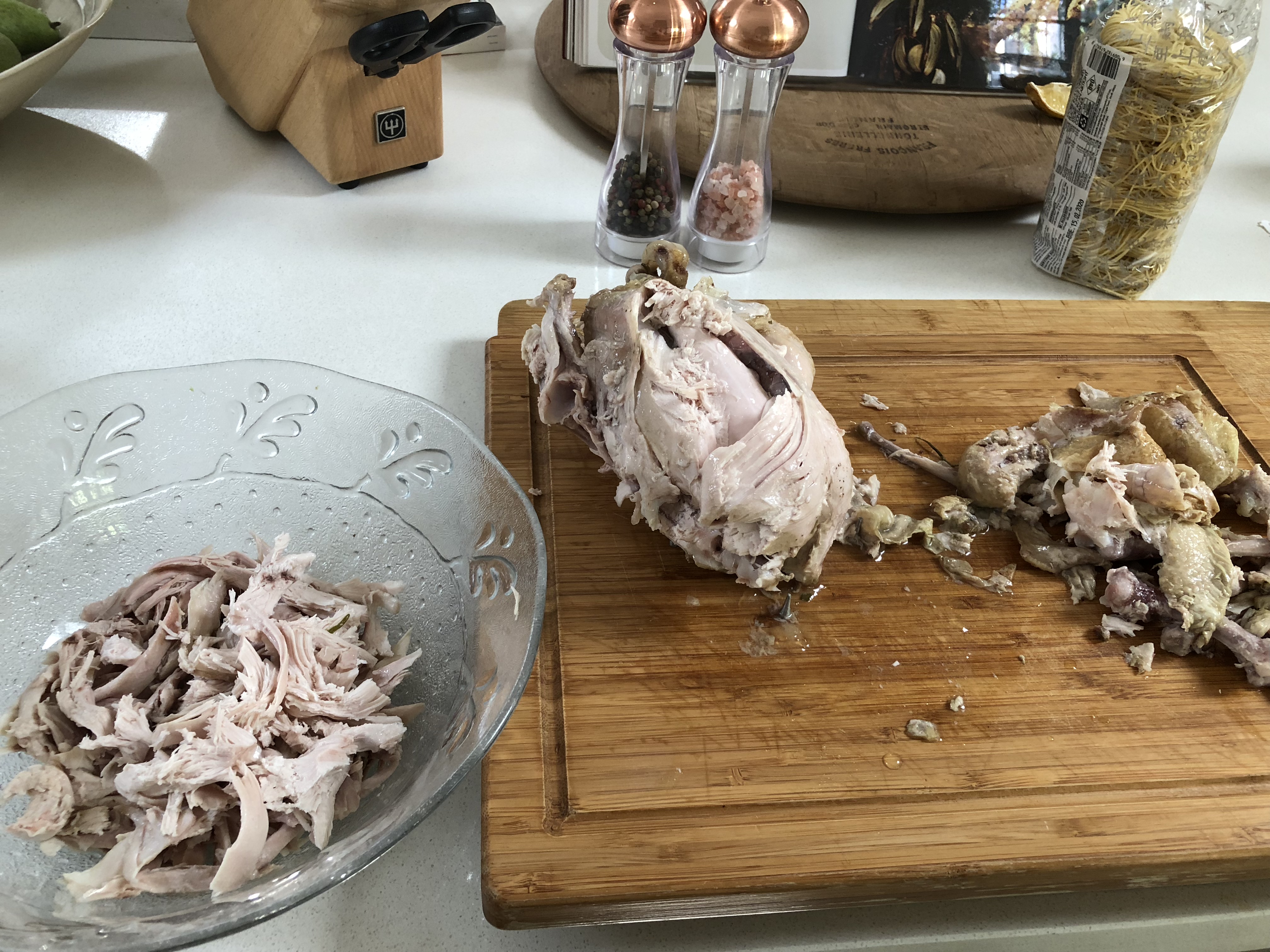 If you’re making the soup over 2 days (my recommendation), cool the soup in the fridge overnight, and the next day skim off any excess fat which will have solidified on the surface. Remove the chicken for shredding and strain the soup liquid into a pot. My husband helped me with this activity last time and we forgot to put an empty pot under the strainer. Don’t do that. You will lose soup! (It can happen when you have small children and it’s been a long day).
