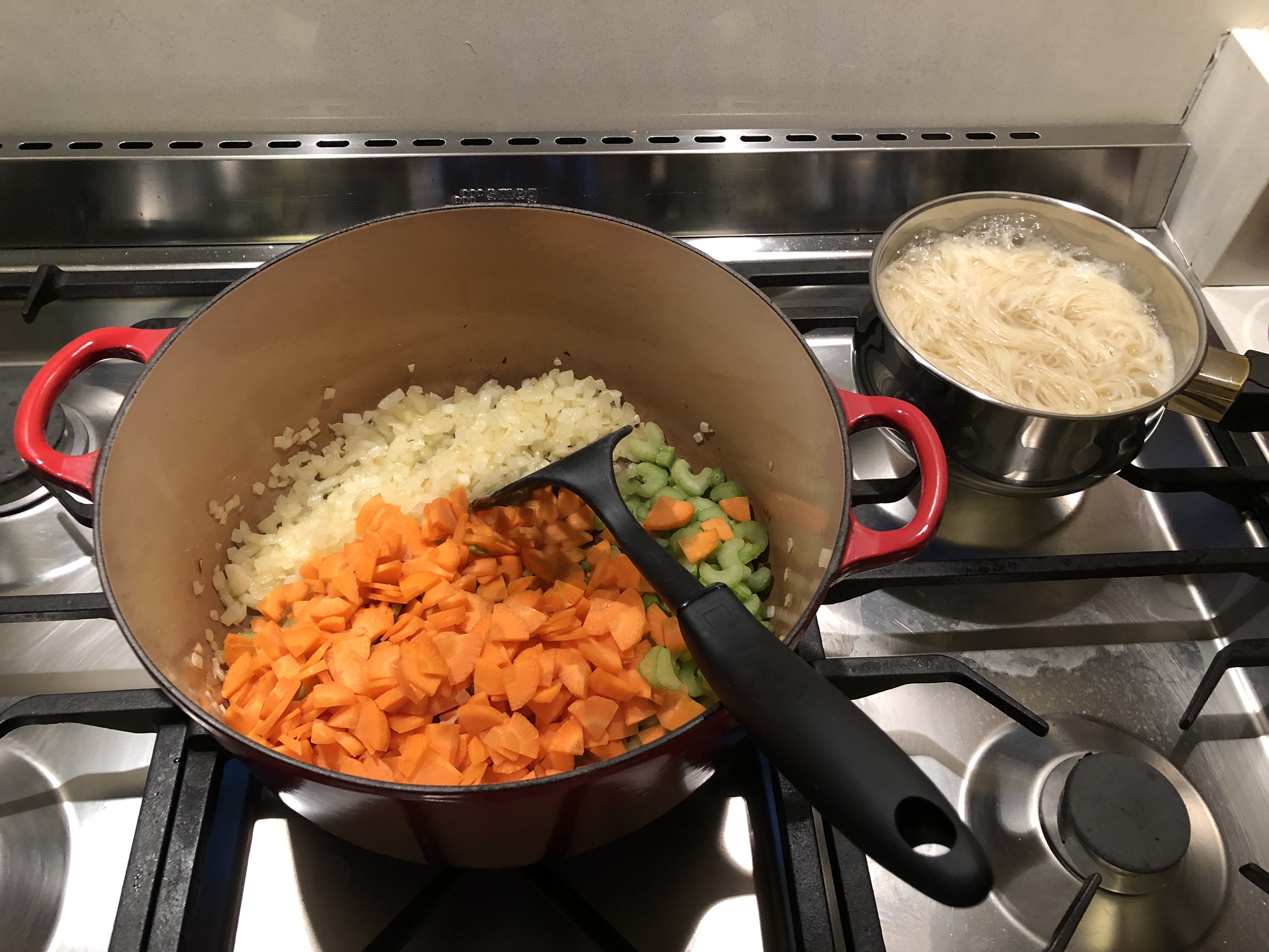 Fry the onions in a little butter and olive oil, and when you see the lovely golden brown colour coming through as they start to caramelise, add the carrots and celery and fry for a further couple of minutes. You can boil the noodles in the meantime. I break the hard noodles up into smaller bits before boiling. Because they cook so quickly, it’s safer to cook them and add them right at the end of the process so they don’t end up too soft & mushy.